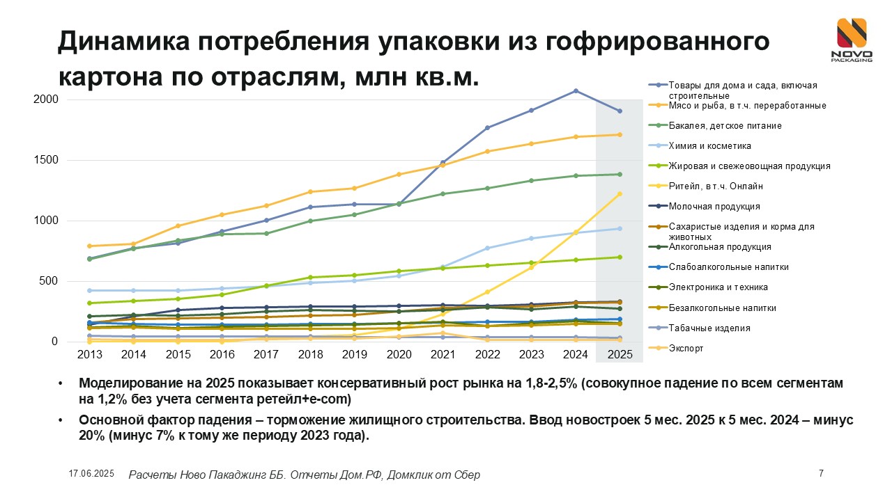 В 2025 году темпы роста рынка ощутимо снижаются, и, по собственным расчетам Ново Пакаджинг ББ окажутся на уровне 2%. Основная причина связана с общим замедлением темпа роста экономики, где фактором сдерживания выступает уровень ключевой ставки ЦБ. Ограниченное кредитование как населения, так и бизнеса, укрепившаяся в данных условиях модель осознанного потребления ведет к снижению потребительской активности и спроса.