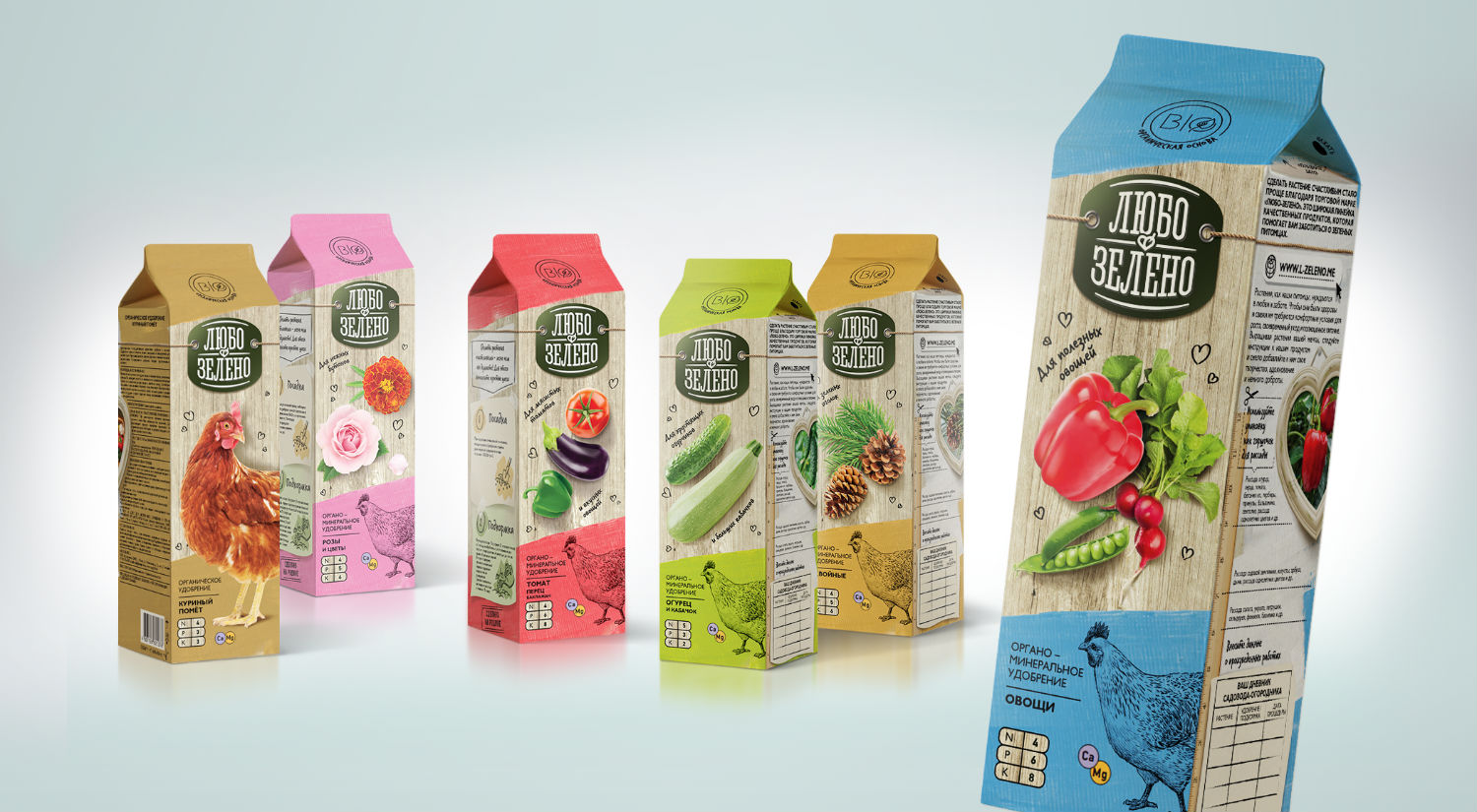 Работу с упаковкой мы вели, понимая, что трансляция смыслов будет сконцентрирована в самом дизайне. Нам помогло то, что для данных продуктов были выбраны нетипичные для категории упаковочные решения, например пакет Pure Pack, который позволил разместить на упаковке больше просветительской информации об уходе за растениями, что является коммуникационным решением концепции бренда «Любо-Зелено». Плюс ко всему, эта упаковка лучше подходит для изображения ярких плодов и цветов.